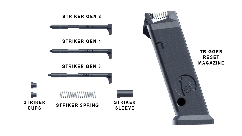 Installing the Wolfdog system is a multi-step process which consists of removing the existing striker, replacing it with the training striker, and placing the training magazine into the magazine well.